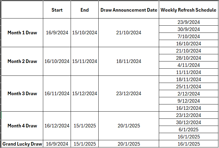 To view the prizes available in our Shop & Win promotion, simply select the “About Farmpride Campaign” option in the main menu of our WhatsApp chatbot. You can then type “What prizes can I win?” to receive a list of prizes for both the monthly draws and the grand draw.